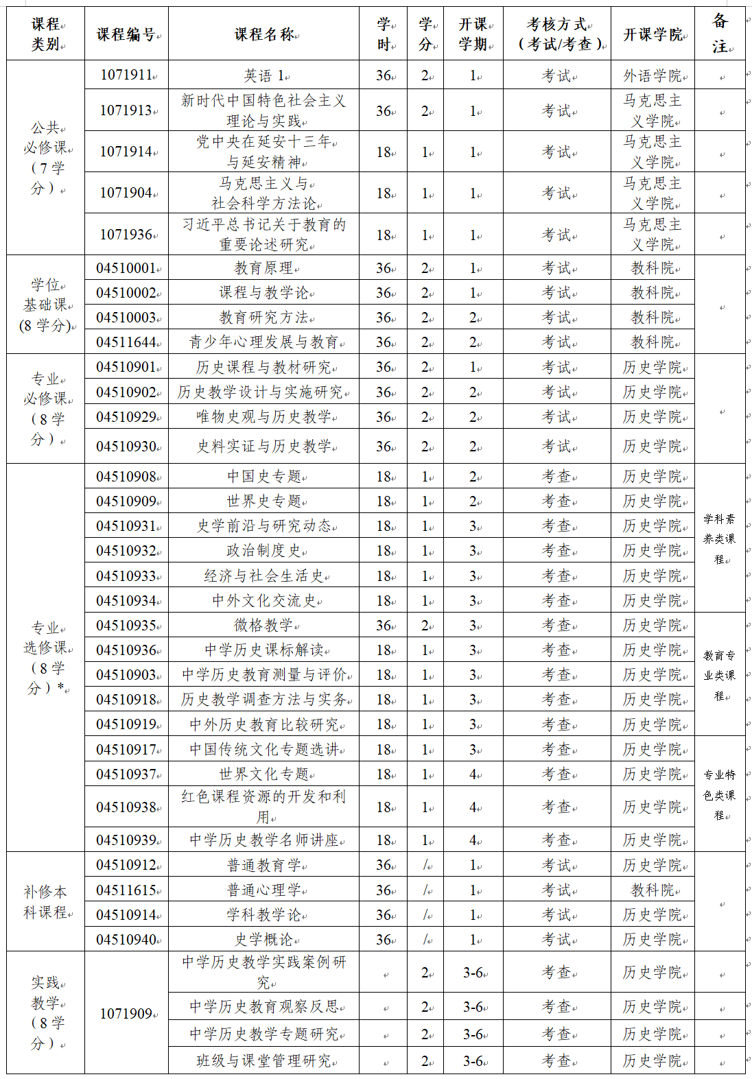 学科教学(历史)领域专业学位硕士研究生课程设置