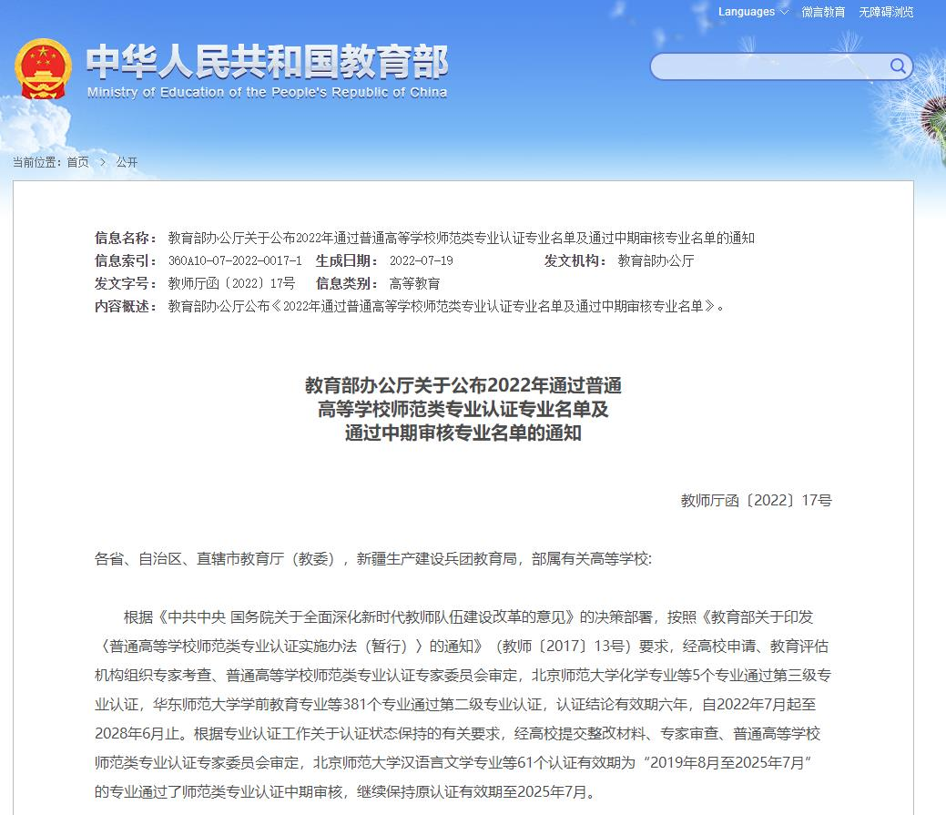 2022通过普通高等公司师范类专业认证的专业名单