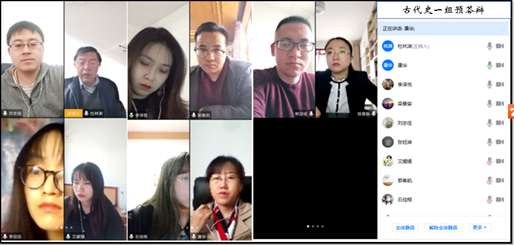尽管历史系在研究生教学及班会管理的过程中使用过远程会议模式,但采用大规模的线上方式还是头一次。参加本次预答辩的研究生共计28人,分别为17级学术型硕士研究生20人、18级专业学位硕士研究生8人,共分配为五个小组(古代史一组、古代史二组、近现代史一组、近现代史二组、学科教学历史组),参与教师近25人,同时组织低年级硕士研究生加入视频会议旁听学习。