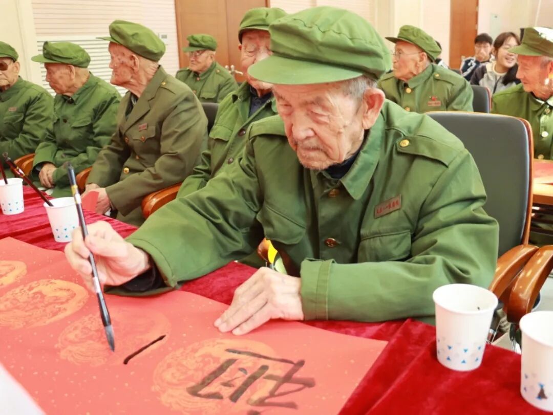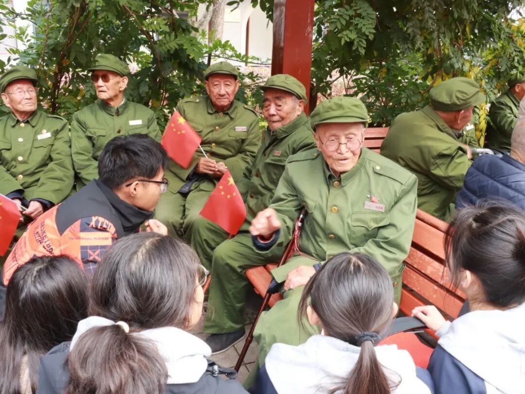 在互动环节,同学们还向在场的每位老英雄敬赠亲手制作的剪纸和书法作品,一笔一画都彰显出同学们的崇敬与感激之情。随后学子们与革命前辈一同前往院内,围坐交流、认真聆听前辈讲述戎马生涯中的光荣事迹,在闲话家常间传递温暖陪伴。
